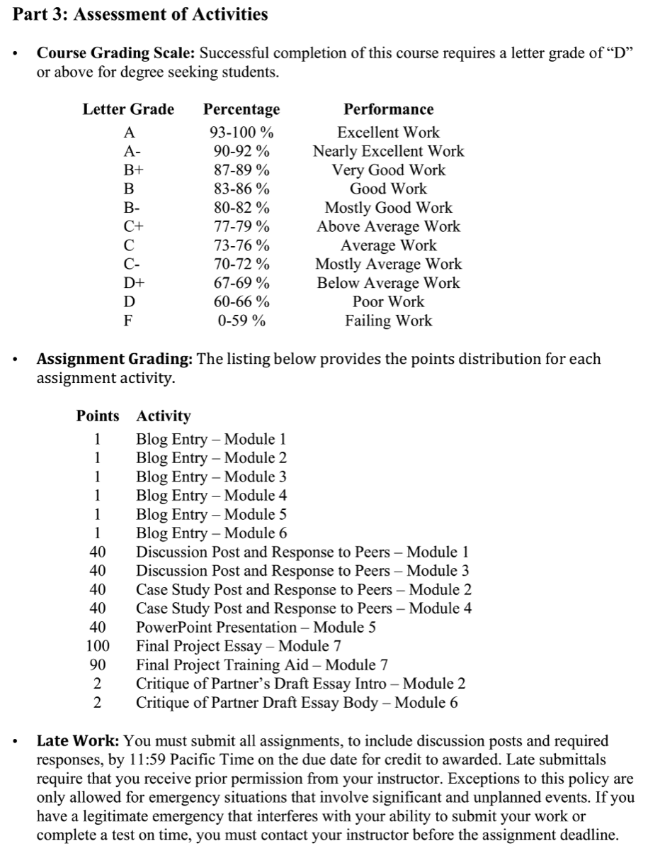 The content of a syllabus is rooted in the purpose that it serves for the instructor, students, and academic institution. For the instructor and students, the syllabus serves as a contract by communicating crucial aspects of the course such as class dates, grading policy, attendance expectations, assignment requirements, and accommodations. Specific to students, the content of a syllabus allows students to assess the relevance and importance of course content to their learning needs as well as how to plan for the course and develop specific study strategies. For the academic institution, the syllabus provides an accountability function and permanent record that is useful when evaluating instructors, courses, and programs. The syllabus provided below is for the “Fundamentals of Law Enforcement Crisis Negotiation” course that I developed as part of the E-Learning and Online Teaching Graduate Certificate Program.